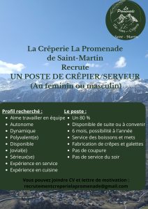 Le poste : 35h/semaine, disponible de suite ou à convenir, 6 mois avec possibilité à l’année, service des boissons et mets, fabrication des crêpes et galettes, pas de coupure, pas de service du soir.